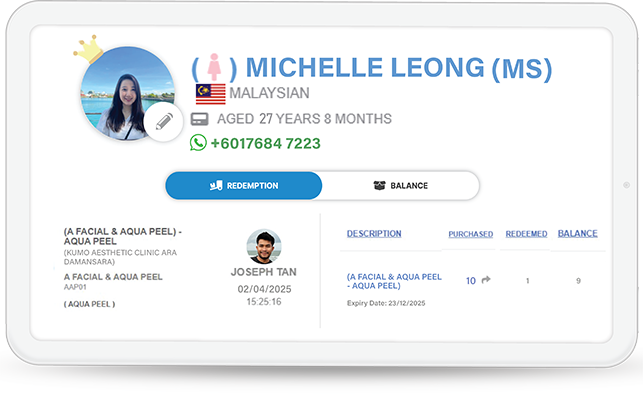 告别繁琐的套餐和产品兑换追踪。有了此功能,您可以实时管理和监控来自不同分店的每一次客户兑换,确保您和客户始终获得最新信息。Aoikumo™  让这一过程自动化且精准,助您轻松经营医疗美容诊所、美容院或以服务为主的健康养生业务。