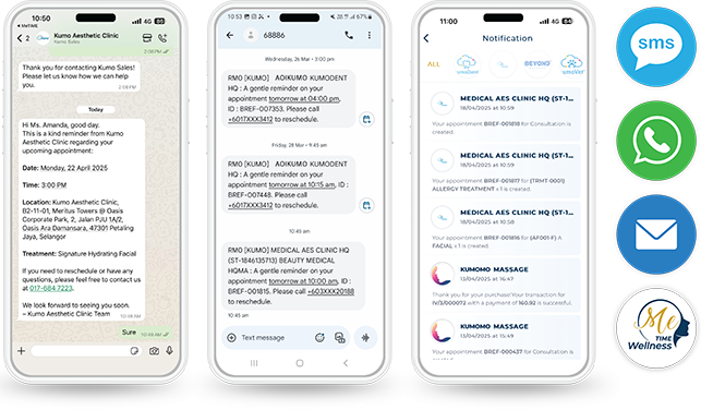 通过 WhatsApp、短信、电子邮件或 MeTIME Wellness 自动发送预设的预约提醒、跟进消息和收据。您可以自定义消息模板并提前安排发送,以确保客户及时收到即将到来的预约提醒、跟进通知和付款提示。这有助于减少您的行政工作量,通过一致和及时的沟通提升客户体验,并最大限度地减少爽约情况。