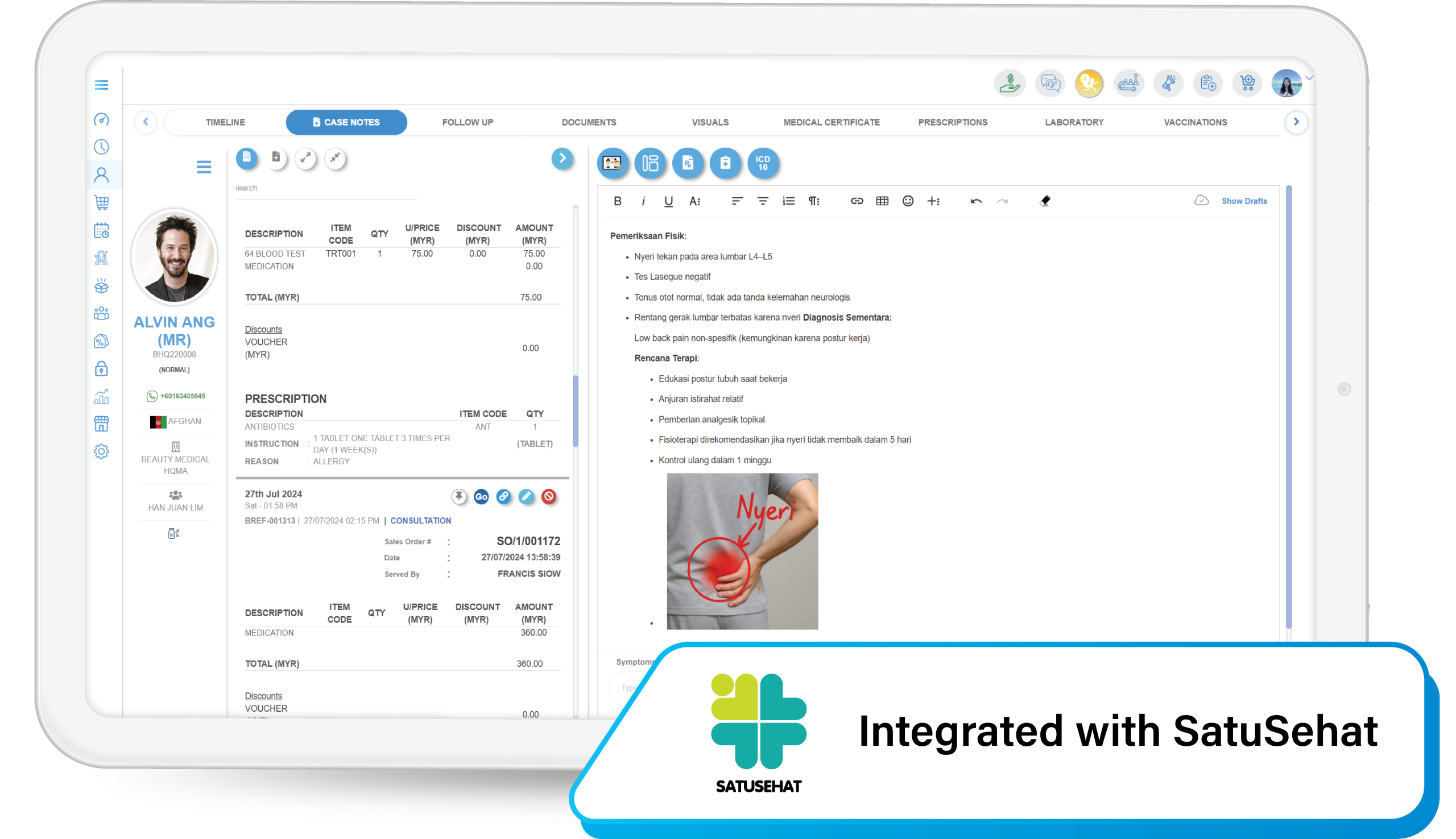 与 SatuSehat 完全整合,以符合印度尼西亚卫生部(Kementerian Kesehatan Republik Indonesia – KEMKES/KKRI)所制定的法规。患者数据和医疗记录会与 KEMKES 服务器实时同步,确保您的诊所保持合规,同时系统会根据监管要求处理报告和连接。