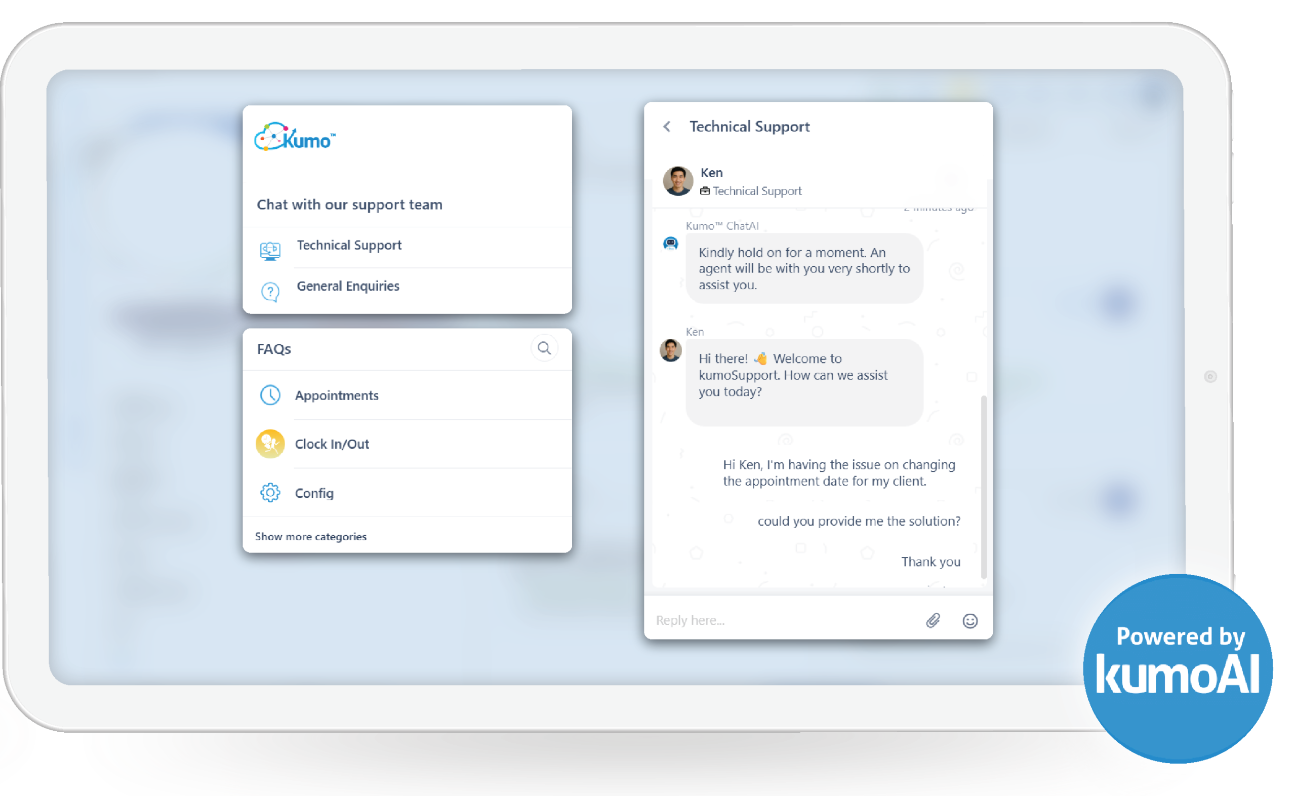 免费获取与 Aoikumo™ 完全集成的 kumoSan,带来无缝体验。通过该应用,员工可以轻松管理他们的工作日程、预约、佣金以及上下班打卡。无需额外投资独立的考勤系统,这让您的团队能够独立处理任务—且完全免费。