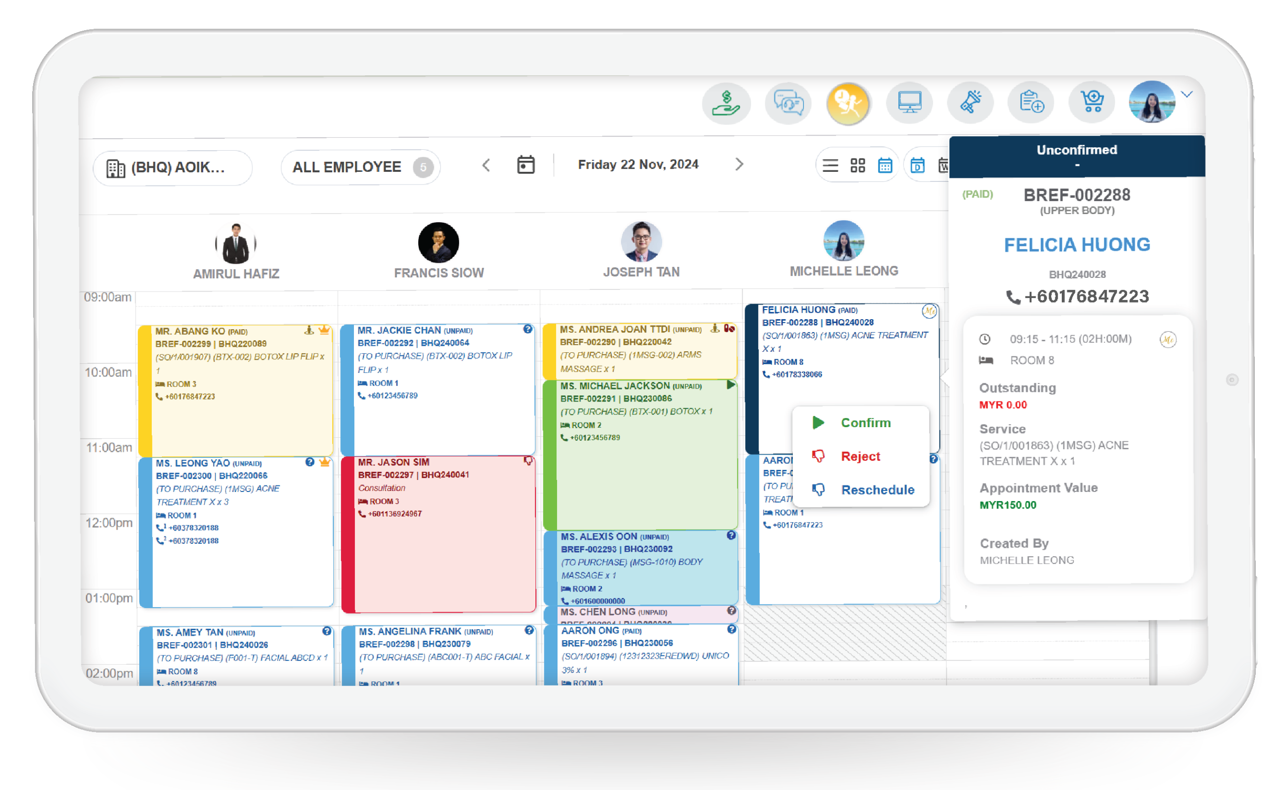 通过 Aoikumo™ 的自动提醒、实时日历同步、在线与智能预约功能,提升预约规划与管理。这些功能有助于减少爽约,通过精准追踪可用时段避免over booking,并根据员工和服务时长设定预约上限,从而实现更好的时间管理、提升客户满意度,并确保运营流程更加顺畅高效。